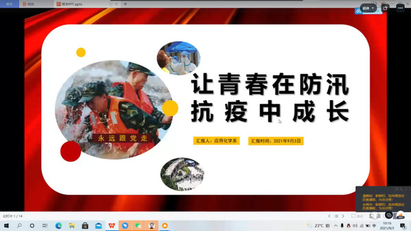 活动中,各团支部紧紧围绕全国人民众志成城抗洪抢险、灾后重建以及抗击疫情的真实案例和鲜活素材,开展形式多样的学习活动。其中,部分团支部面向班级同学征集防汛抗疫主题文艺作品,并在团日活动中展示;学院专职团干杨亚皇结合实例,为同学们讲述了当代青年学子在防汛抗疫中做出的突出贡献和感人事迹;学院20级新能源材料与器件专业基层团支部以朗诵《致敬,防汛一线的战友》创新学习,让主题教育深入人心;高分子材料与工程1801团支部以主题演讲形式带领同学们学习建党精神,展示了党团结带领人民不懈奋斗的光辉历程和伟大成就。
