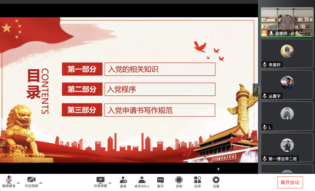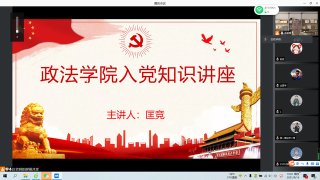 9月16日晚,政法学院举办2021级新生“志存高远 一心向党”入党知识讲座,政法学院组织员匡竞和2021级全体本科生、研究生参加。