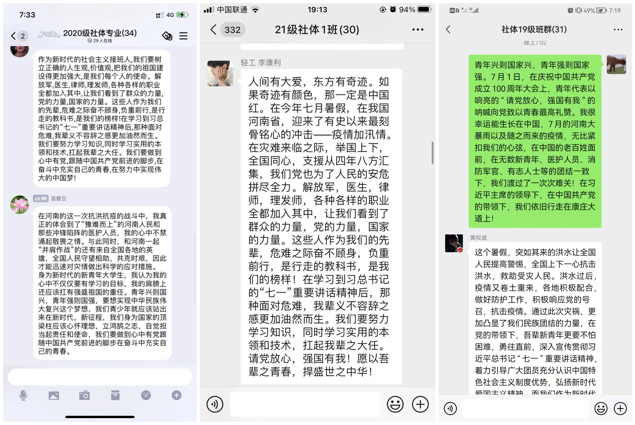 活动中,各班级团支部利用PPT集中学习了习近平总书记在庆祝中国共产党成立100周年大会上的重要讲话精神、习近平总书记视察河南重要讲话重要指示、关于防汛救灾工作重要指示和关于疫情防控工作的重要指示等系列文件精神,全体团员共同观看了全国上下众志成城抗洪抢险和抗击疫情的短视频,各团支部参与防汛抗疫志愿服务工作的团员青年分享了自己在家乡和受灾地区参与防汛防洪与疫情防控的感人事迹。在学习讲话精神,观看感人视频,聆听先进事迹后,全体团员青年受益匪浅,纷纷在班级群发表心得体会。团员青年们表示,通过参与活动,更加认识到了祖国的制度优势,更加坚定了中国特色社会主义的道路自信、理论自信、制度自信、文化自信。我们将更加努力学习专业知识与技能,积极响应党的号召,坚持为人民服务的宗旨,从自身做起,承担起应有的社会责任,不遗余力报效祖国。