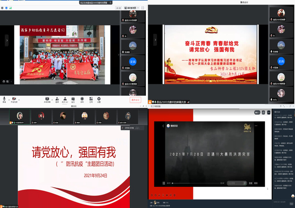 在此次活动中,各团支部带领同学们集中学习了习近平总书记“七一”重要讲话精神,深刻领悟一百年来党的艰难奋斗历程以及党带领人民取得的辉煌成就,明确新时代青年学子的责任与担当。同时,各团支部组织大家线上观看了全国人民众志成城抗洪抢险、灾后重建和抗击疫情的视频资料,深刻感受灾难面前展现出的中国精神和中国力量;邀请学院参与家乡防汛抗洪和疫情防控的志愿者们进行交流分享,以先进典型的真实案例和鲜活素材引导同学们勇担时代使命,积极奉献社会。在洪水肆虐之际,我院学子积极投身志愿者队伍中,进行防汛物资统计和搬运抢险工作,他们主动作为、尽己所能,在防汛救灾一线为守卫家园构筑起一道道“青春堤坝”。暴雨过后,疫情又起,我院学子不畏艰险,主动向社区和村镇报到,协助开展疫情排查与防控、安全防护与消杀、数据登记与统计、核酸检测准备及疫苗接种服务等工作,学院共计百余名学生参与防汛抗疫志愿服务,46人收到政府部门表彰证书及感谢信。