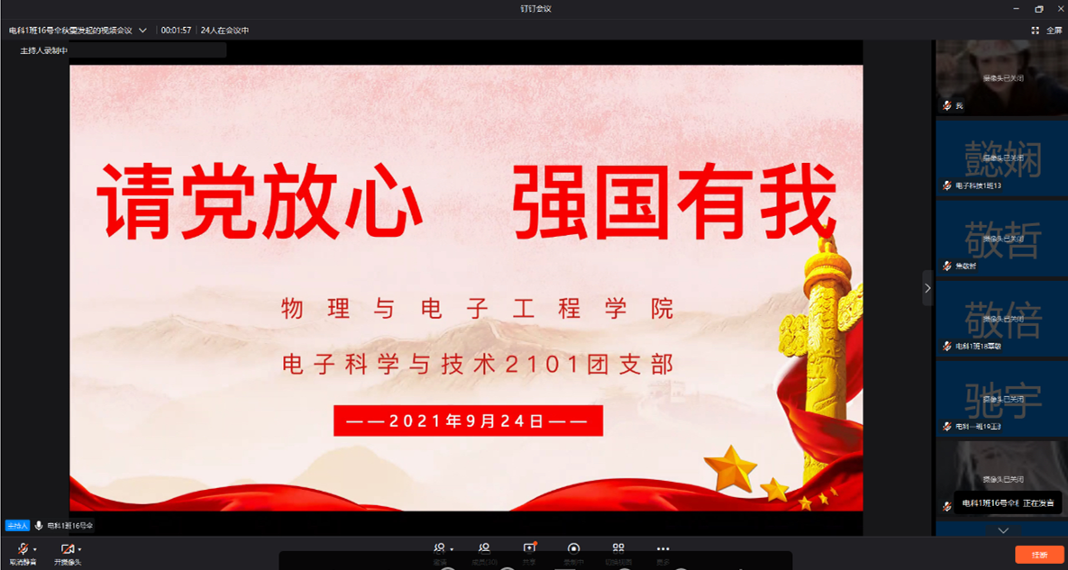 为深入学习贯彻习近平总书记“七一”重要讲话精神,加强对团员青年的思想引领。九月下旬,物理与电子工程学院各班团支部开展了“请党放心,强国有我”主题团日活动。