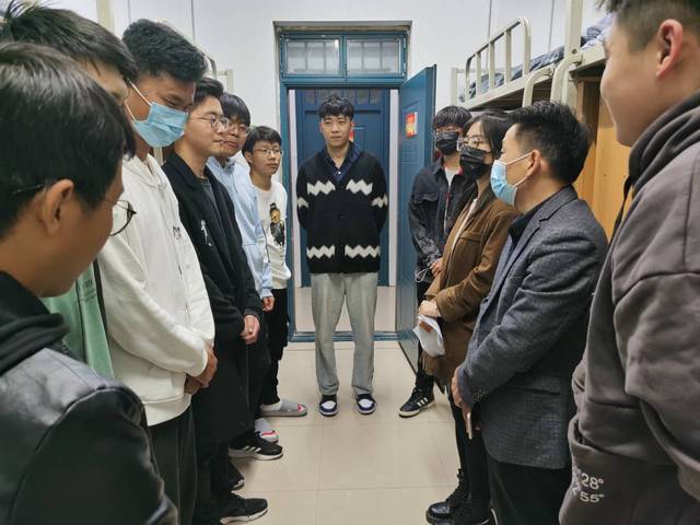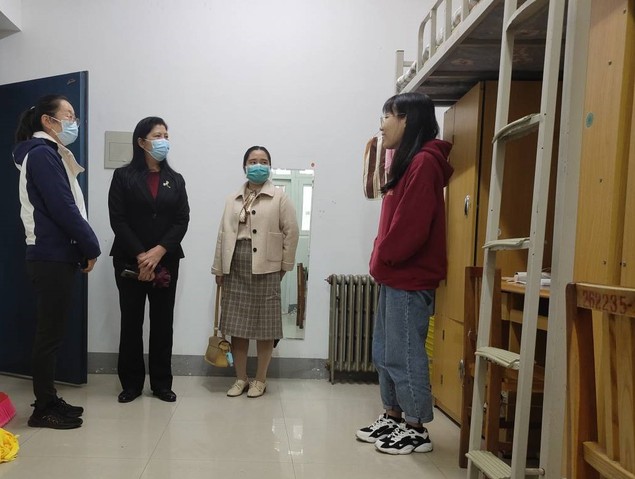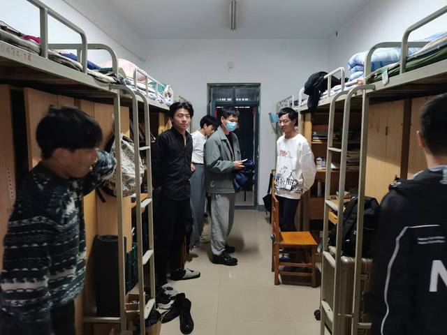 在返校同学的宿舍,老师们对同生们返校后的宿舍生活状况进行了亲切且详细的询问,叮嘱同学们遵守疫情防控相关规定,每天按时完成打卡,同时认真排查寝室是否存在违规违章现象,提醒同学们注意保暖,且适时开窗通风、杀菌消毒,在校期间要加强安全防范意识,适当参与体育活动,增强身体素质。