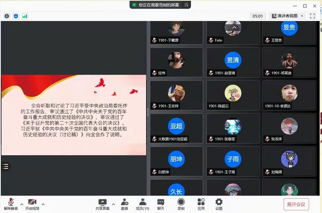 活动过程中,在各班团支书的带领下,广大青年团员共同观看了央视网发布的“中国共产党第十九届中央委员会第六次全体会议公报”视频,学习了习近平总书记在全会上的重要讲话精神。全会审议通过的《中共中央关于党的百年奋斗重大成就和历史经验的决议》,全面总结了党的百年奋斗重大成就和历史经验,振奋人心,催人奋进。同学们纷纷表示要从党的百年奋斗史中汲取奋进力量,坚定不移地听党话、跟党走,不断强化新时代青年的使命担当,努力为实现中华民族伟大复兴贡献青春力量。
