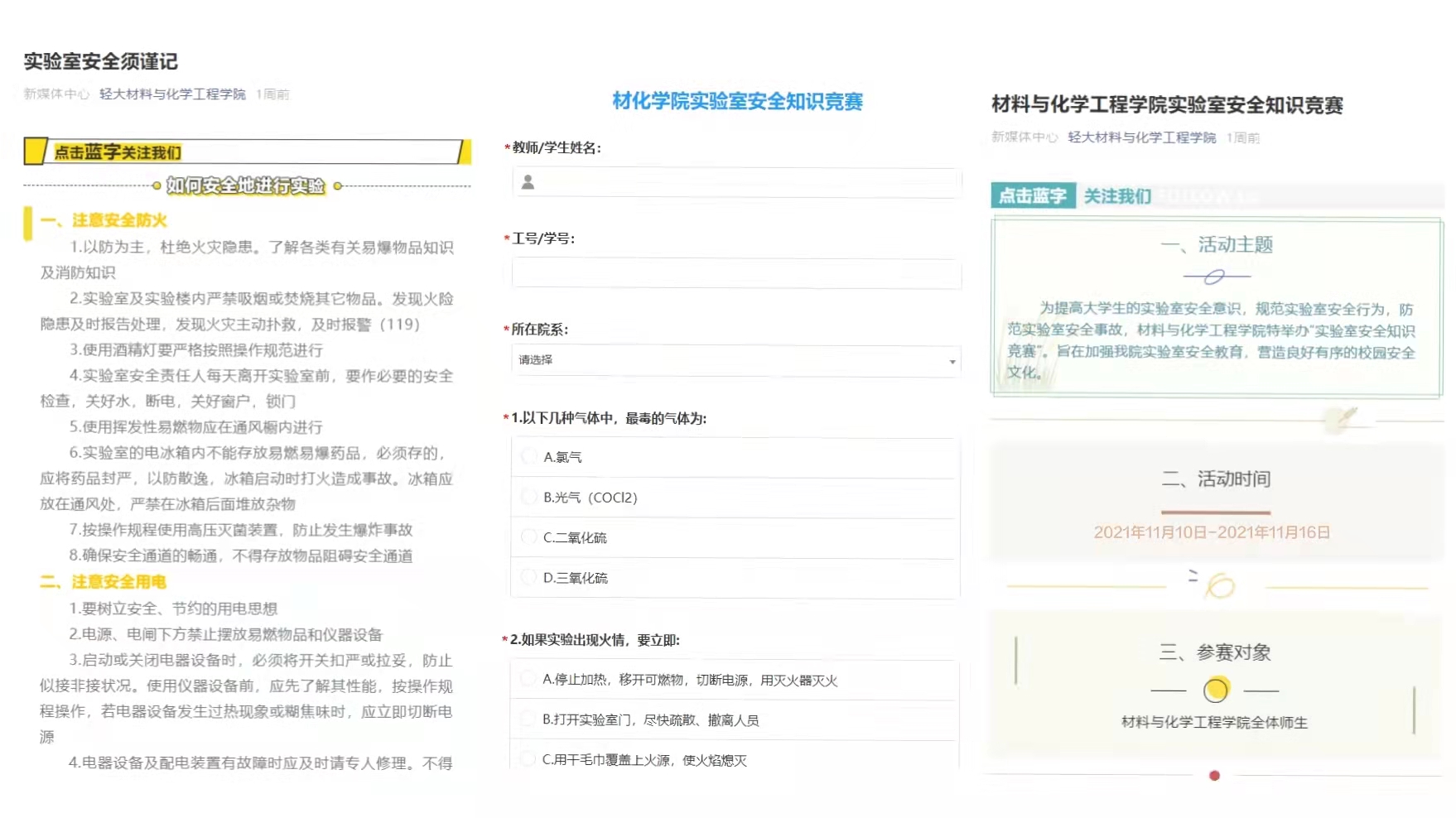 为提高大学生的实验室安全意识,规范实验室安全行为,防止实验室安全事故发生。11月10日-11月16日,材料与化学工程学院举办安全教育系列活动之线上实验室安全知识竞赛。