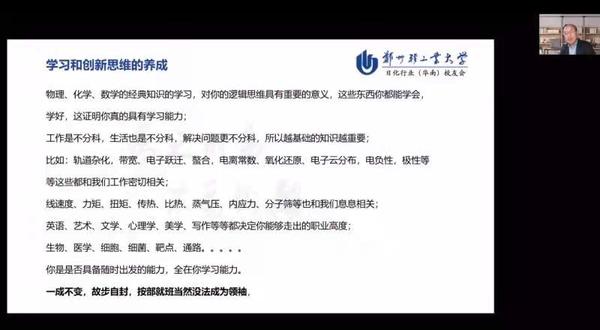 张太军校友首先讲述了我校日化专业方向的发展历程,简单介绍了日化(华南)校友会的情况,从基础知识学习、专业技能提升、创新思维培养、创新能力等方面进行了详细的分析和讲解。在讲解过程中,张总引经据典,深入浅出,运用了大量企业实例,强化同学们的专业认同,他强调,大家要利用好学校的学习平台,端正学习态度,变被动接受为主动探索;要多了解社会情况,明确目标,理论与实践结合,做到融会贯通,更希望在校生能够参与校友会的一些活动,深入了解行业的发展内涵,将来都能成为行业的顶尖人才。