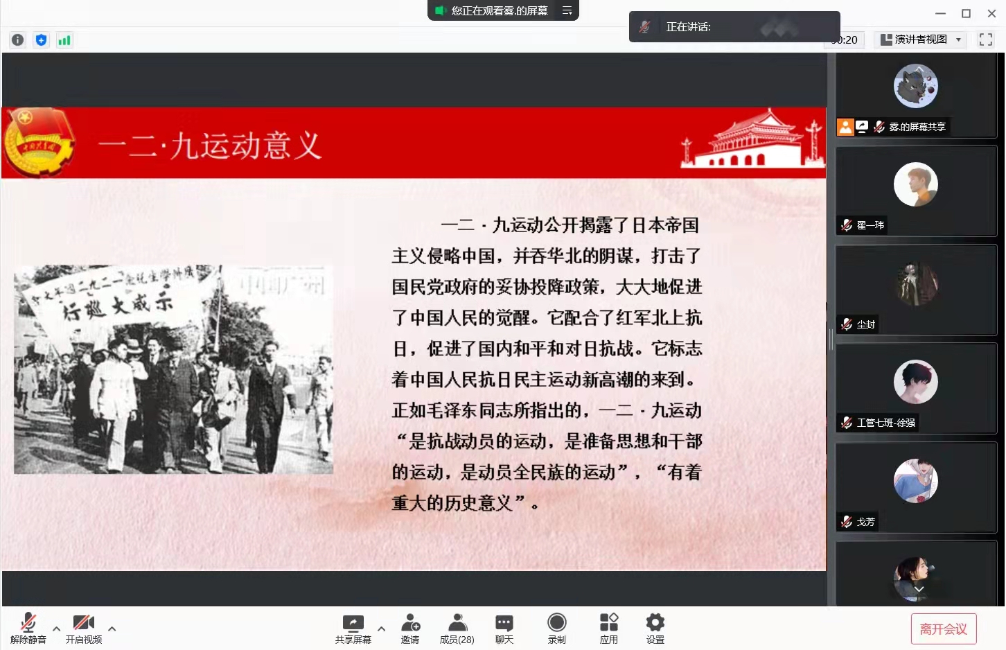 本次活动以“铭记一二·九精神 接力一百年复兴”为主题。首先,主持人介绍了“一二·九”运动的背景和意义,重温先辈们经历过的光辉历史,倡导大家铭记“一二·九”精神,把爱国情怀贯彻到生活的方方面面。接下来,通过观看相关视频,同学们进一步了解一二·九运动的相关历史,体会学习了革命先辈的伟大奋斗精。最后,与会同学分享了自己对于“一二·九”运动精神的理解和心得体会。经济学2102班曹永芳同学认为,作为新时代青年,不仅要在思想上爱国,更要在行动上爱国,铭记历史、奋发有为,迎难而上、披荆斩棘,真正做到强国有我。同学们纷纷响应,表示要认真学习党史,继续和发扬爱国主义精神,在实现中华民族伟大复兴中国梦的光辉历程中勇担青春使命,努力奔跑,奋力追梦。