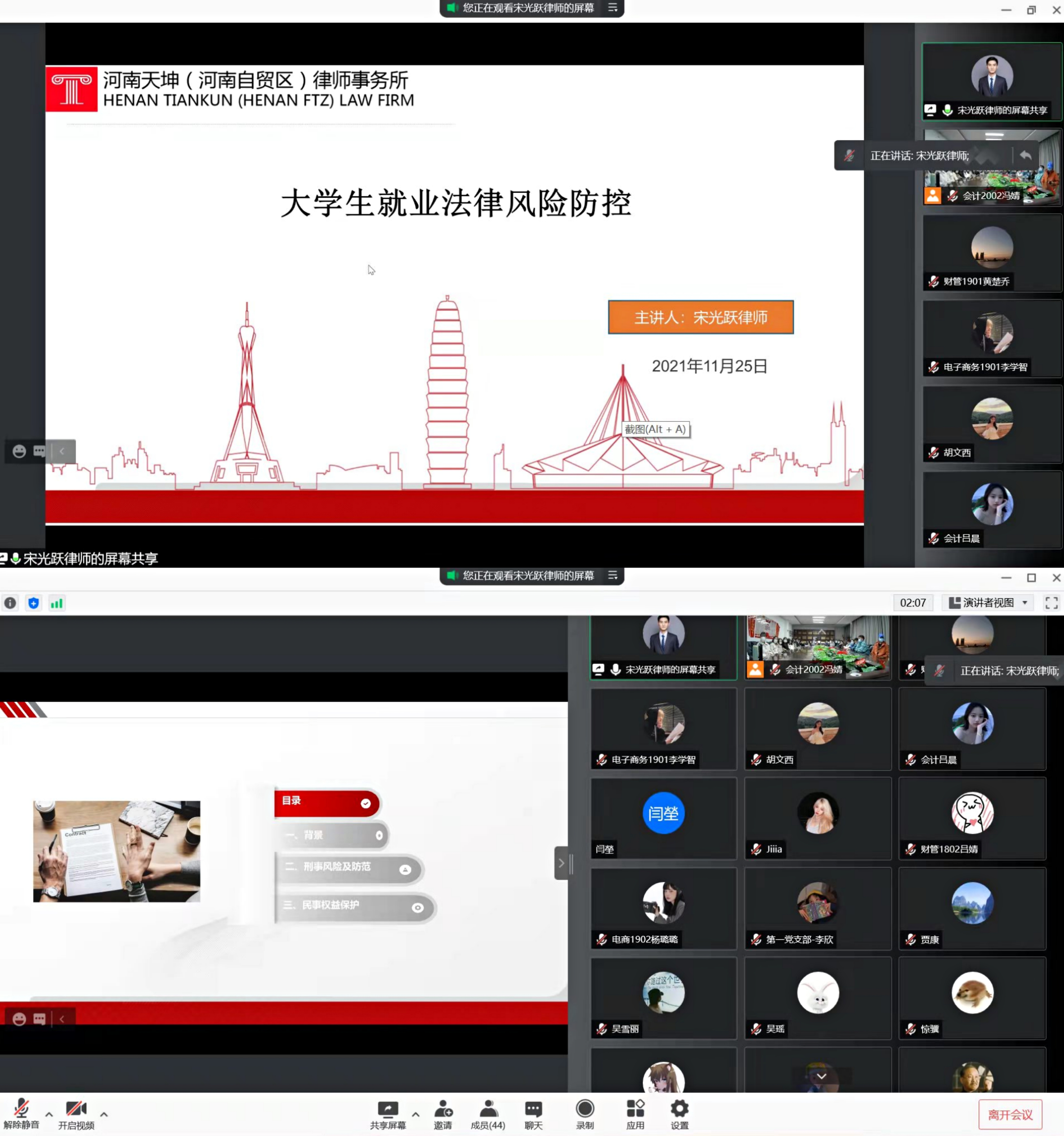 为将“我为师生办实事”落到实处,进一步做好2022届毕业生就业指导工作,帮助大学生在就业过程中增强法律风险防范意识,学会用法律进行自我保护。11月25日下午,经济与管理学院邀请2015级财务管理专业毕业生,河南天坤(河南自贸区)律师事务所专职律师宋光跃做“大学生就业法律风险防范”知识讲座。本次讲座由学院组织员孙沛涵老师主持,2022届毕业生及第二党支部全体党员聆听了本次讲座。