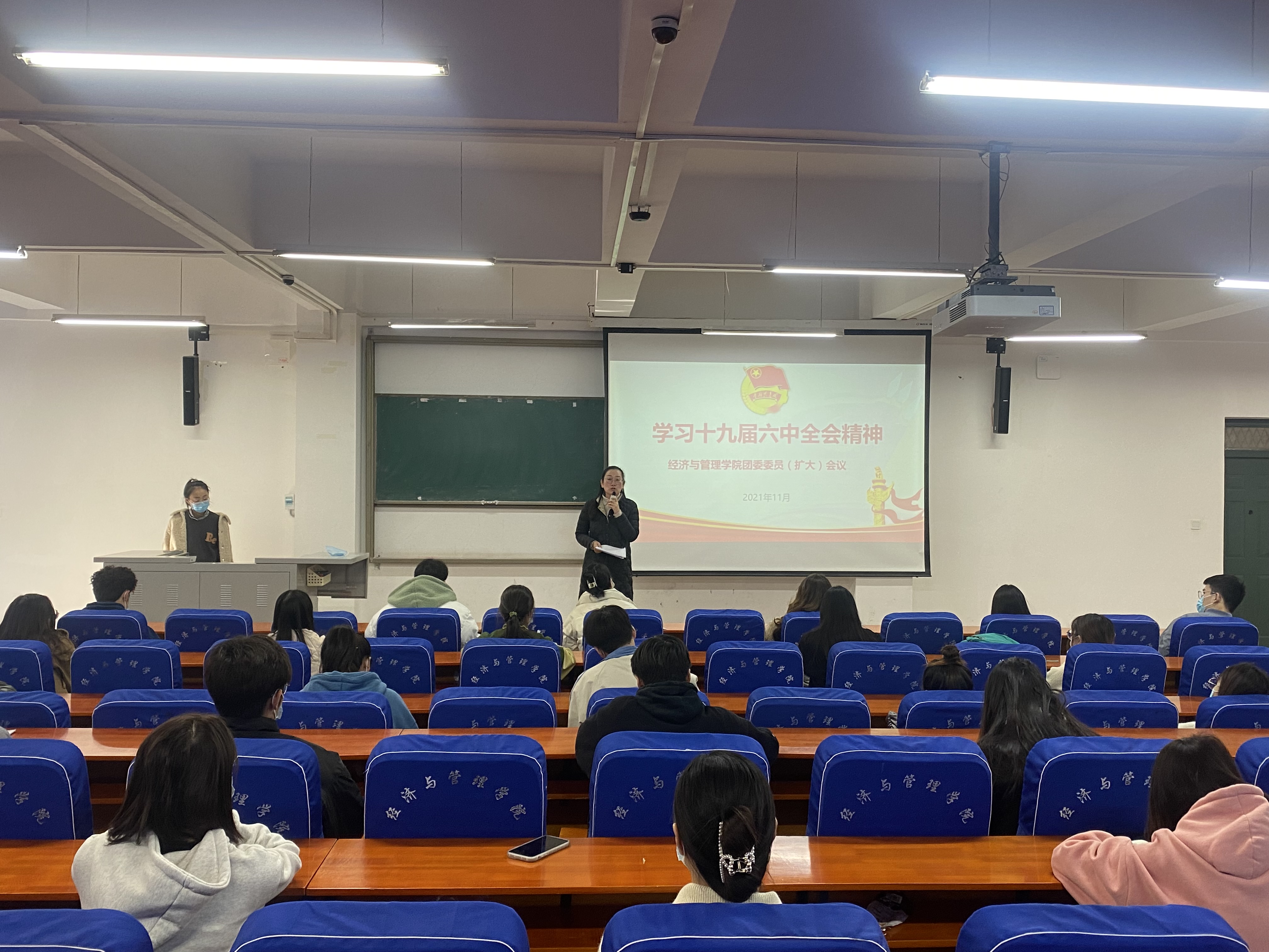 为深入学习贯彻党的十九届六中全会精神,深化拓展党史学习教育,经济与管理学院于11月29日中午在经管楼211室开展学习党的十九届六中全会精神团日活动。学院团委书记姚少华老师、青马班学员和各级团员干部代表参加了本次会议,21级团员干部同步在线上通过腾讯会议进行观看学习。