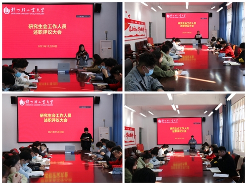 此次会议以公平、公正、公开为宗旨,进行述职评议工作,以视频汇报与现场汇报两种方式进行汇报,会上,研究生会主席团及部门负责人分别从学期工作总结,存在的问题及对策,工作展望三个方面进行了述职。述职同学对述职工作高度重视,认真准备,立足岗位职责,结合部门实际,查摆工作中存在的不足,明确下一步的改进方向。随后,研究生代表们通过不记名投票的方式对工作人员进行考评。经过集中测评,我校研究生会工作人员满意度全部达标。