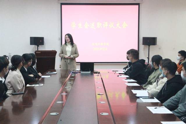 为持续深化学生会改革,提高我院学生会工作人员服务同学的意识和履职能力,机电工程学院于12月1日中午在西三楼215召开2021年学生会述职评议大会。学院团委书记孔馨雨、学生会全体工作人员和学生代表参加了评议大会。