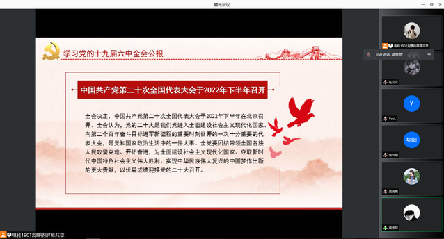 为深入学习贯彻党的十九届六中全会精神,提升团学干部理论素养。11月28日晚,物理与电子工程学院在四教楼510开展学习党的十九届六中全会精神主题团课活动。团课由学院团委书记周芳华老师主讲,学院青马班学员,团校培训班学员代表参加了团课学习,会议采用线上线下结合的方式进行。