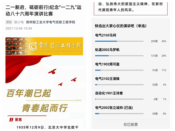 本次活动旨在深入学习贯彻习近平总书记在党史学习教育动员大会和中国共产党成立100周年大会上的重要讲话精神,帮助广大学生重温百年党史、汲取智慧力量、传承红色基因,引导电气学子缅怀革命先烈,共抒爱国情,推进我院党史学习教育走深走实。为了响应防疫号召,本次活动通过线上比赛的方式普及“一二·九”的历史知识,以演讲的流畅,情感的表达,主题的契合等作为本次评选的标准。比赛以公众号投票的方式选出一二三等奖。