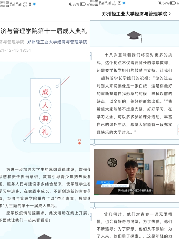 本次成人典礼以“青年有志,时代新声”为主旨,通过师生录制视频向2021级新生表示诚挚的关心与祝福。首先,学院专职辅导员苏震、邢辰老师在视频中表达了对21级新生初入校园的祝贺与欢迎,并带领大家回顾了在7月河南省洪水中的感人故事以及在对抗新冠疫情期间的感动时刻。同时,老师们对同学们提出了希望和要求,在成长成人的过程中青年同学应坚持用汗水浇灌收获,以奋斗笃定前行,勇做走在时代前列的奋进者、开拓者、奉献者,让青春始终成为中华大地上朝气蓬勃的持久风景。其次,我院邀请了2019、2020级的优秀学生代表为21级新生送出了独特的视频祝福,号召大家应不忘初心、树立远大志向;砥砺前行、担当青春使命。最后,我院21新生积极响应,通过视频的方式向老师与学长学姐的祝福表示感谢,并纷纷表示将牢记使命担当,激扬青春之志、抒发青春之情、奉献青春之力,书写属于青年一代的崭新篇章。