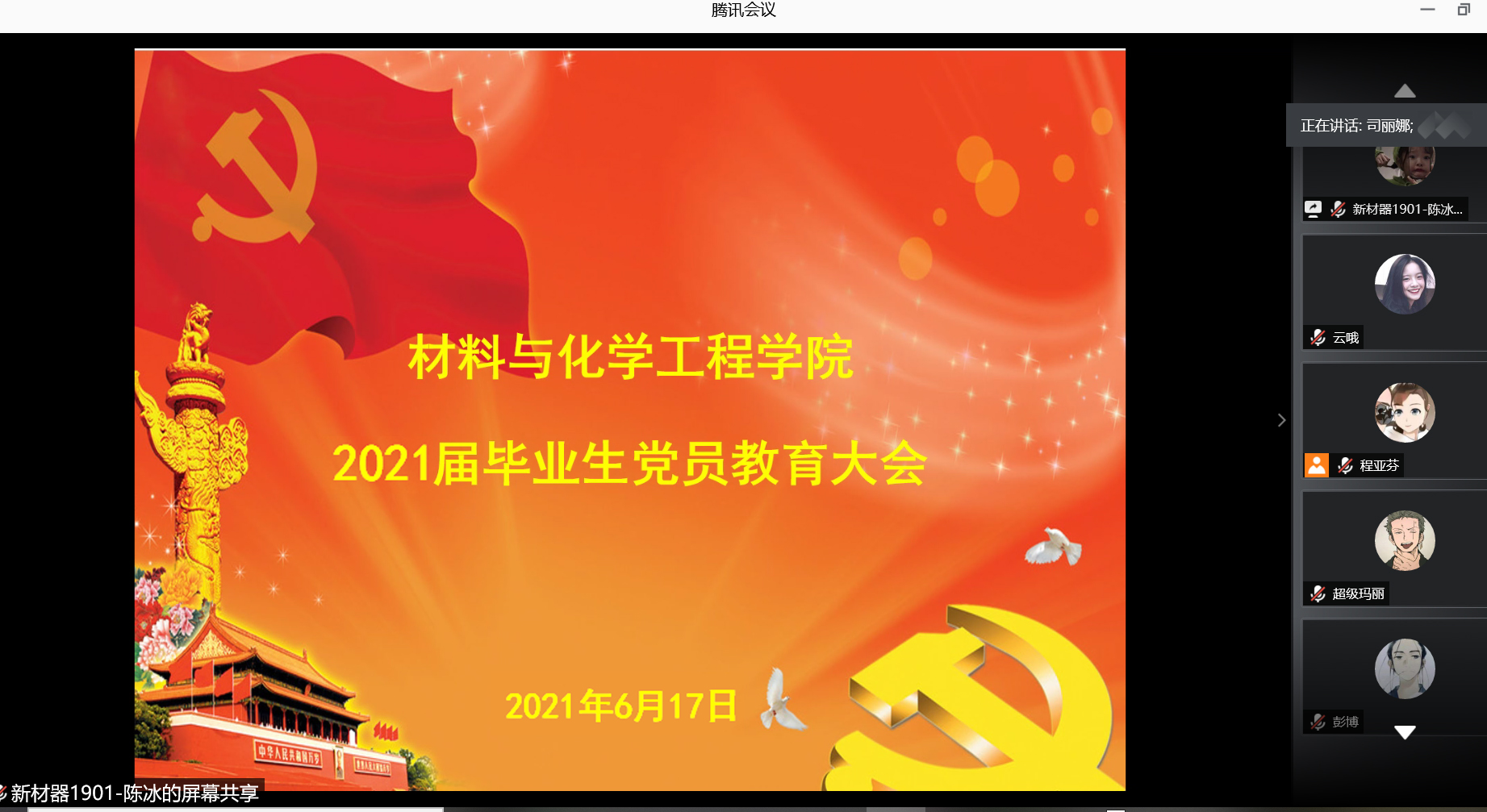 在2021届毕业生即将离校之际,为树立强烈的社会责任感,保持拼搏的精神,增强安全法制观念,材料与化学工程学院召开毕业生廉洁教育大会,加强毕业生的思想教育,切实做好毕业相关工作,培养毕业生清正廉洁意识,党委副书记司丽娜、辅导员李瑞瑞、辅导员程亚芬、二百余位学生参与此次线上视频班会。