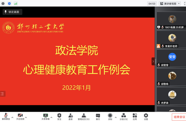 1月25日下午,政法学院召开寒假期间心理健康教育线上工作会。学院副书记刘放美、心理工作室全体成员和各班级心理委员参加会议,会议由心理健康教育专职辅导员李昊轩老师主持。