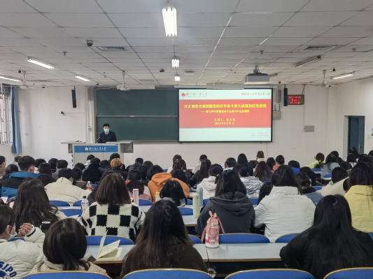 为深入学习宣传贯彻党的十九届六中全会精神,引导青年学生深刻领悟党的百年奋斗重大成就和历史经验、自觉树立唯物史观和正确党史观,2月21日上午,经济与管理学院党委书记张云超结合形势与政策课教学,以《以正确党史观把握党的百年奋斗重大成就和历史经验》为题,在科学校区三教楼104教室为学生讲授春季开学思想政治教育“第一课”,学院2020级财务管理、国际经济与贸易专业150余名学生参加学习。