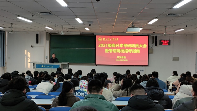 2月23日下午,政法学院在三教楼107室举办2021级专升本学生考研动员大会暨考研院校报考指南讲座。学院党委书记宋德涛老师、副书记刘放美、就业专干匡竞、李昊轩及2021级专升本全体学生参加了会议。