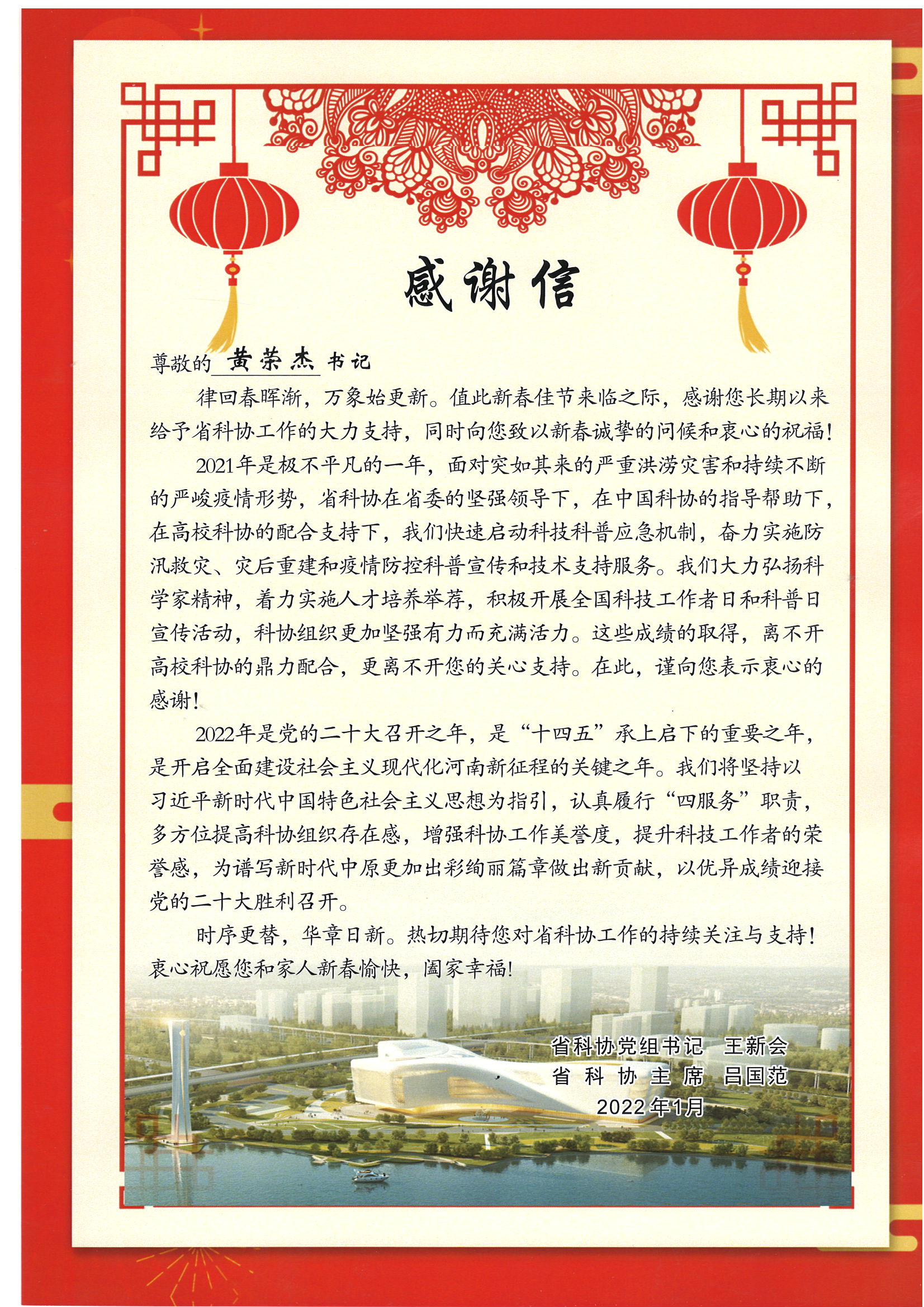 同时,河南省科学技术协会向校党委书记、校长黄荣杰同志发来感谢信,充分肯定了我校在科普领域所做的工作及对省科协工作的大力支持。