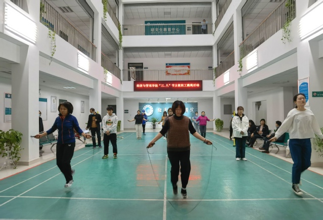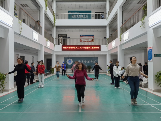 为了倡导我院女教职工快乐工作、健康生活,增强女教职工体质和凝聚力,庆祝第112个“三·八”国际劳动妇女节,3月3日下午,经济与管理学院工会在经管楼南门大厅举办了2022年“三·八”节女教职工跳绳活动。