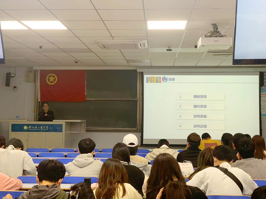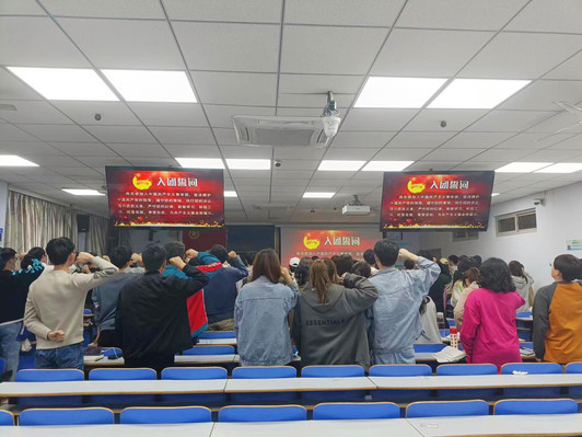 张老师以“重庆谈判 谈打结合”为主题,带领大家重温了重庆谈判过程的艰难曲折。采取“自然渗透 润物无声”的方式,讲述了重庆谈判是人民力量的一次胜利,影响了以后中国革命的历史进程,引导广大青年学子学史明理、学史增信、学史崇德、学史力行;讲述了从播下革命火种的小小红船,到领航复兴伟业的巍巍巨轮,引导学生坚定理想信念,厚植爱国主义情怀。最后,重温入团誓词,铭记初心使命。“我志愿加入中国共产主义青年团,坚决拥护中国共产党的领导,遵守团的章程,执行团的决议,履行团员义务……”在鲜红的团旗下,在场全体成员庄严举起右拳,温誓词、忆初心,一字一句,铿锵有力,催人奋进。