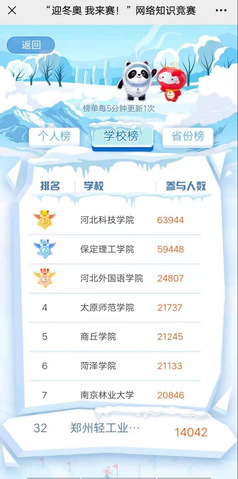 近日,由共青团中央青年发展部、国家体育总局群众体育司、中国青年报社主办,中国青年网承办的“迎冬奥,我来赛”网络知识竞赛活动落下帷幕,我校荣获优秀组织奖(高校榜)。