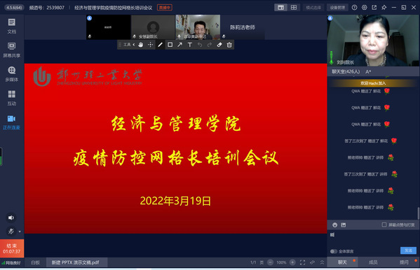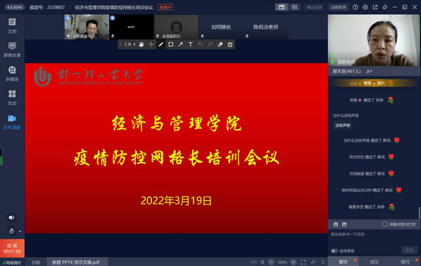 近期全国、省内疫情多点爆发,疫情形势异常严峻复杂,为扎实做好学院疫情防控,全力保障师生健康和校园安全稳定,3月19日下午,经济与管理学院召开疫情防控网格长培训会议。校医院郭莉、学院领导班子成员、全体专兼职辅导员、班主任、班长团支书和寝室长参加培训会议。会议由学院党委副书记陈章美主持。