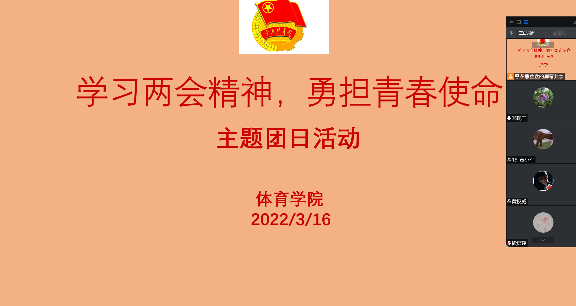 为使广大团员青年能够更加深入地了解全国两会,学习两会的重要精神,提高同学们的思想政治觉悟,3月16日,体育学院利用腾讯会议开展了“学习两会精神,勇担青春使命”线上主题团日活动。体育学院各学生组织团学骨干和部分团员代表参加了此次活动。