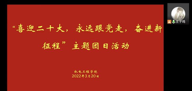 为喜迎党的二十大胜利召开,深入学习贯彻习近平总书记关于青年和共青团工作的系列重要论述精神,进一步推动党史学习教育走深走实,3月20日机电工程学院各团支部举办“喜迎二十大、永远跟党走、奋进新时代”线上主题团日活动。