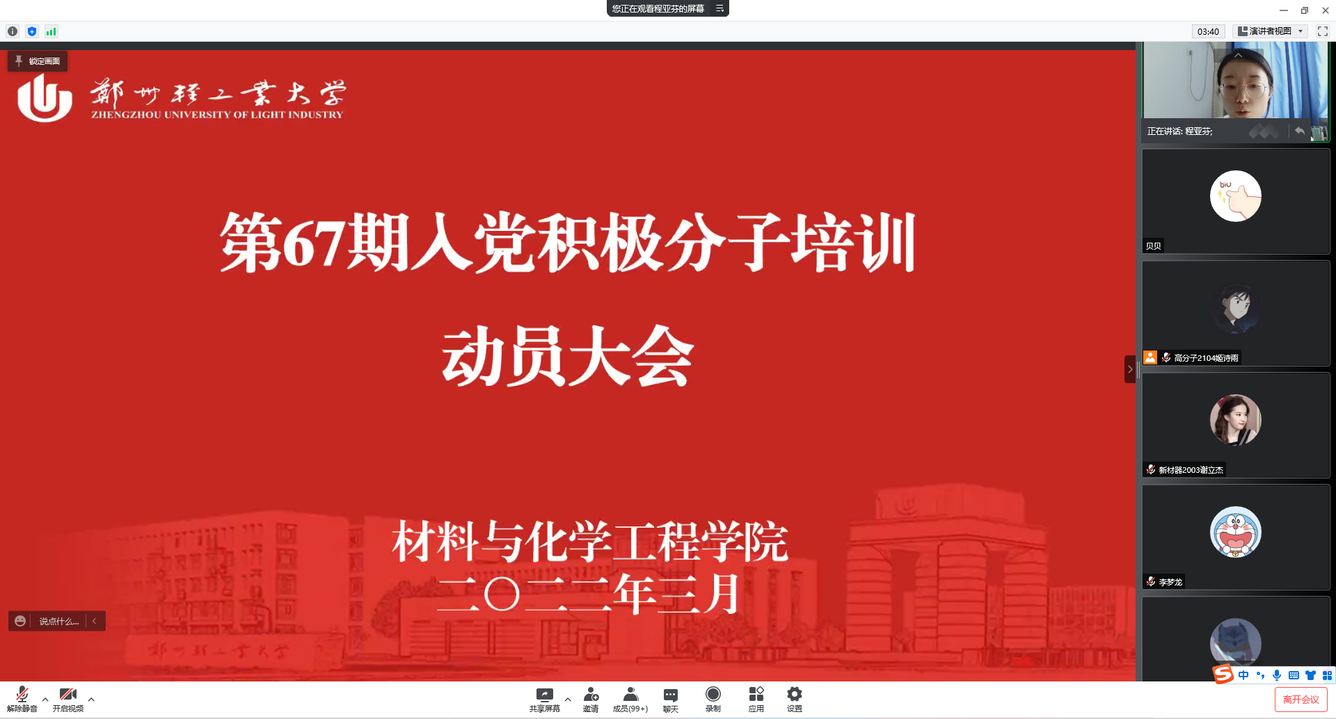 3月28日,材料与化学工程学院通过线上召开第67期入党积极分子党课培训动员会,负责党务工作的程亚芬老师、全体67期入党积极分子参加了本次动员会议。