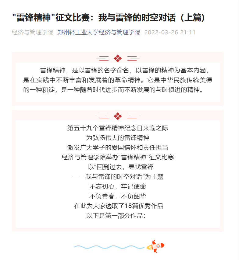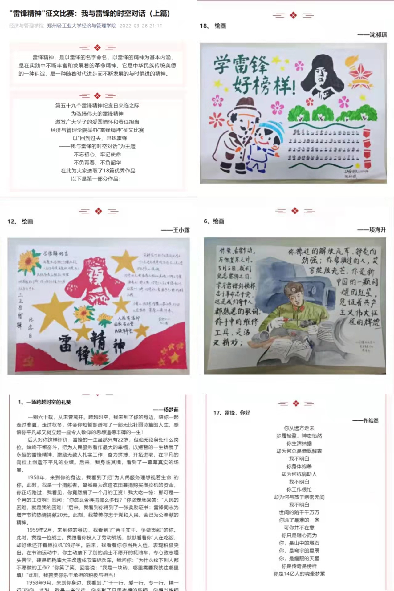 在第59个学习雷锋纪念日来临之际,为弘扬雷锋精神,进一步引导学生了解“人人争先,乐于奉献”的雷锋精神,激发同学们的写作热忱,展现经管学子奉献友爱、互助进步的精神面貌。经济与管理学院于3月15日-30日期间举办了轻青小课堂——“回到过去,寻找雷锋——我与雷锋的时空对话”主题征文比赛。