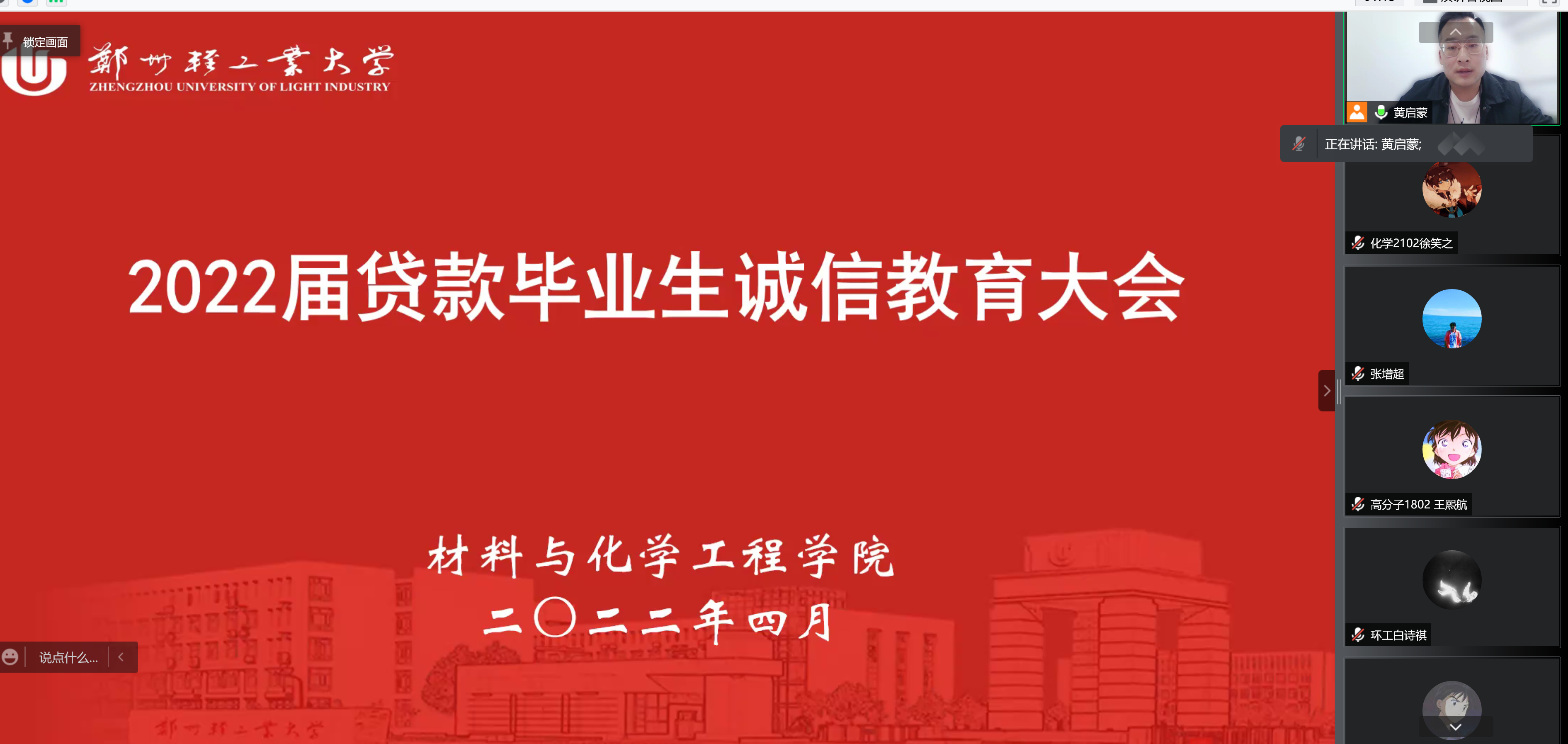 为进一步落实国家助学贷款政策,加强毕业生诚信教育。4月4日中午,材料与化学工程学院通过腾讯会议平台召开了2022届贷款毕业生诚信教育大会。会议由负责学生资助工作的黄启蒙老师主持,全体校园地贷款毕业生参加会议。
