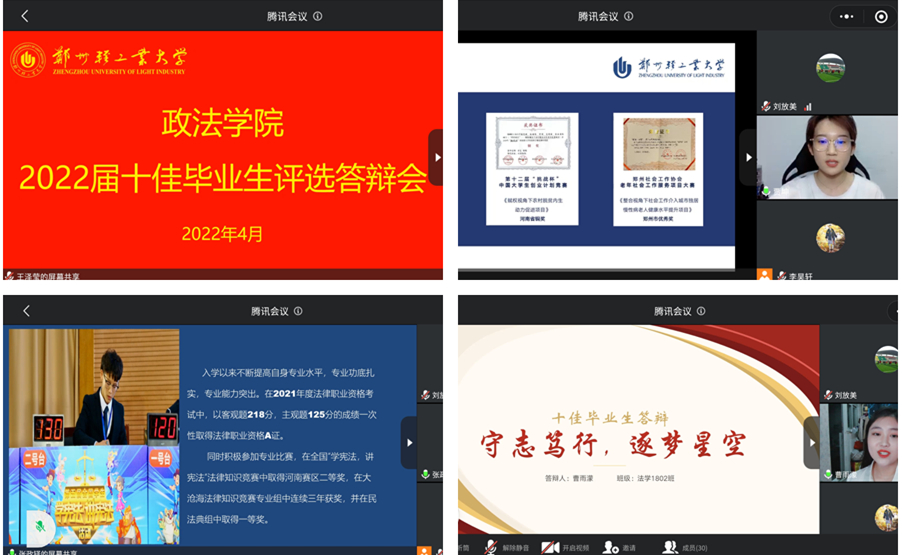 4月7日晚,政法学院举办2022届十佳毕业生评选答辩会,学院党委副书记刘放美、就业专职老师李昊轩、各年级学生代表和候选人参加此次评选答辩会,会议由李昊轩老师主持。