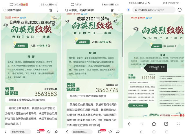 各班级同学通过“中国文明网”“中华英烈网”“团中央网上祭英烈小程序”“河南文明网”等网上平台,对先烈英模们进行缅怀和悼念。无数的革命先烈抛头颅,洒热血,用鲜血和生命换来我们今天的幸福、美好的生活,我们永远不会忘记那些为新中国献出生命的英雄、烈士。各班级团支部充分引导团员青年进行文明祭祀、云上追思,向革命烈士表达无限的敬意和哀思,弘扬革命精神,继承和发扬党的光荣传统和优良作风,并以实际行动倡导文明祭扫、俭约祭扫,共抗疫情、共度时艰。同学们表示,作为新时代青年,我们要敬重英雄,热爱祖国,继承红色传统、传承红色基因,为国家发展积蓄智慧和力量。