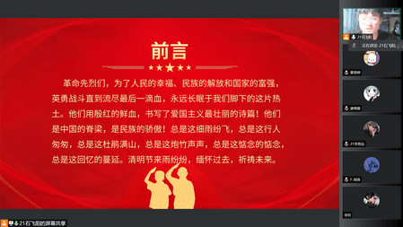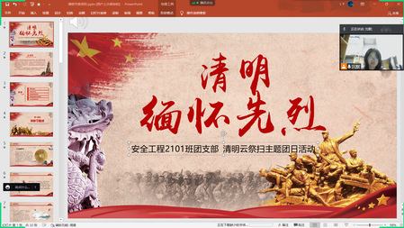 各团支部以清明节为契机,积极响应“缅怀英烈 铭记历史——网上祭英烈”的倡议,通过网络敬献鲜花、思念寄语等文明低碳方式缅怀故人、祭奠英烈,并开展云上追思、红色观影、英烈故事会等内容丰富的团日活动。各团支部或是讲述革命先烈的英勇事迹,加深同学们对革命精神的认识与领悟,领悟自己身上肩负的历史重任;或是观看红色影片,感受革命英雄们高尚的品德、坚韧不拔的精神。同学们纷纷表示,要追寻革命先烈的铿锵足迹,把对革命先烈的缅怀和崇敬之情化作不忘初心、牢记使命的坚定信念,感悟“天下兴亡、匹夫有责”的爱国情怀,以“百折不挠、坚忍不拔”的必胜信念克服前进道路上的一切艰难险阻,勇做走在时代前面的奋进者、开拓者、奉献者。