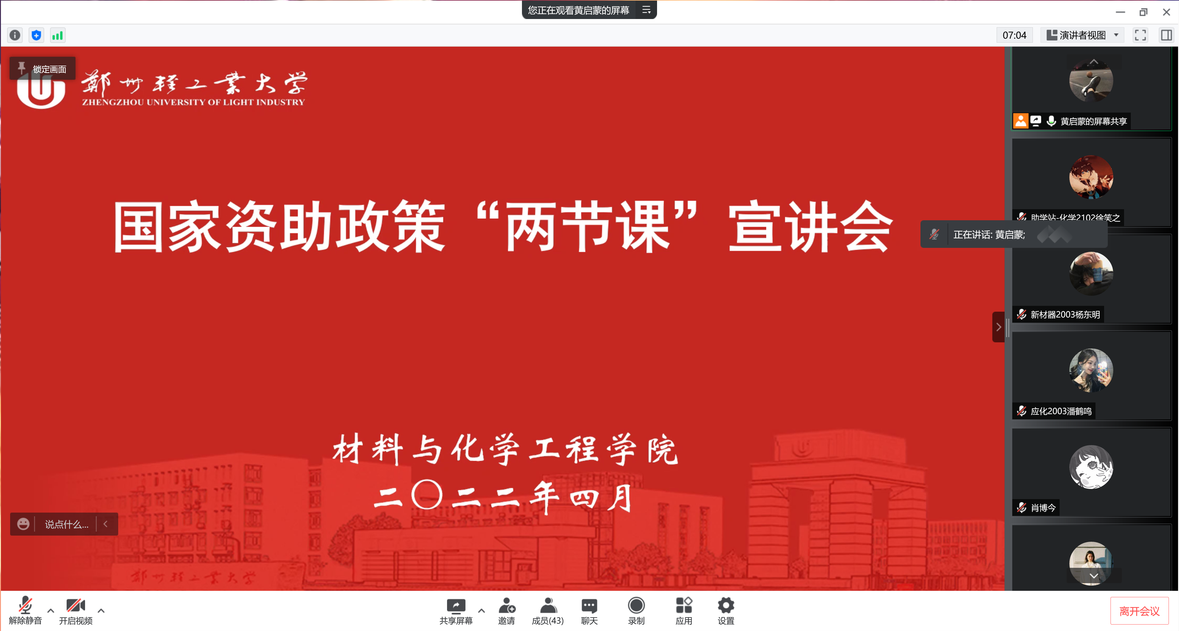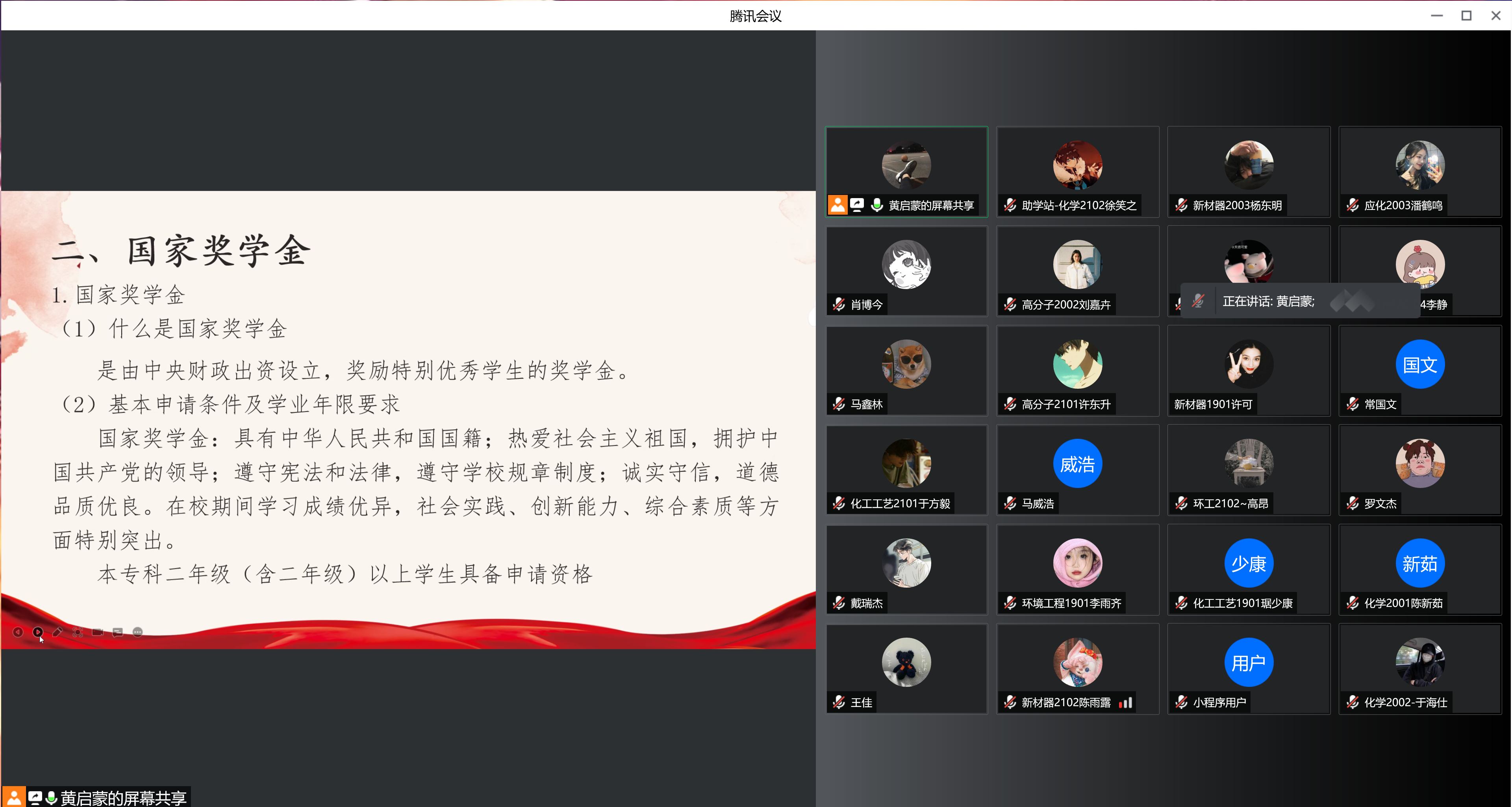 为深入贯彻落实国家高校资助政策,进一步做好学生资助政策宣传工作,推动学院资助工作有序发展。4月14日中午,材料与化学工程学院通过腾讯会议平台召开资助政策“两节课”宣讲会。会议由黄启蒙老师主持。