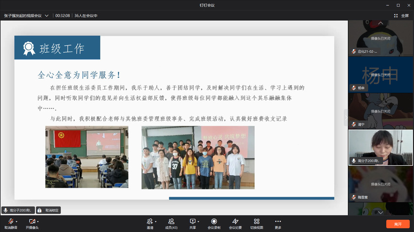 经前期自主申报、各团支部民主评议,申报“十佳共青团干部”和“十佳共青团员”的候选人从思想建设、学习科研、社会实践、创新创业等方面进行展示,详细介绍自入校以来,个人的成长收获、取得的荣誉,每个同学的事迹都展现着“踔厉奋发跟党走,笃行不怠创佳绩”的奋斗精神。接着,申报“十佳红旗团支部”的团支部代表依次从组织结构、团务工作、学风建设、创新引领、实践服务等方面对团支部工作进行总结及亮点风采展示,对今年基层团支部重点工作做出规划展望。最后,经评审小组审定,推荐胡明言、党琳两位同学参加校十佳共青团干部、十佳共青团员评选,推荐高分子材料与工程1902团支部参加十佳红旗团支部评选。