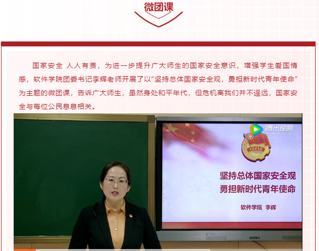 2022年4月15日是第七个全民国家安全教育日。为深入推动国家安全宣传教育工作开展,全面普及国家安全教育知识,软件学院各年级团支部线上开展“树牢总体国家安全观,青春喜迎党的二十大”示范微团课学习活动。