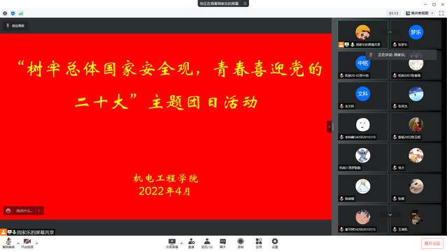 为深入学习习近平总书记关于总体国家安全观的重要论述,教育引导广大青年牢固树立国家安全意识,营造国家安全人人有责、人人可为的浓厚氛围,4月中旬,机电工程学院开展“树牢总体国家安全观,青春喜迎党的二十大”主题团日活动。