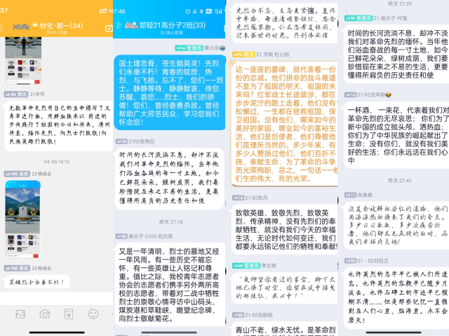 各基层团支部紧紧围绕“忆先烈守初心,逐青春担使命”的主题,开展形式多样的线上学习活动。同学们满怀崇敬之情在网上烈士陵园祭扫英烈,在全景画面起义纪念馆中真实感受了民族危难的历史关头,为夺取抗日战争胜利中国共产党领导人民毅然发动起义做出巨大贡献。随后,同学们对为保家卫国视死如归的革命英烈表示沉痛的哀悼,在网上向烈士敬献了花圈,诵读了对革命先烈致辞。最后,各团支部采用线上群聊寄语的方式,带领同学们再次缅怀革命烈士,感悟党史精神,同学们纷纷表示会珍惜来之不易的美好生活,努力学习,为实现中华民族伟大复兴贡献自己的智慧和力量。