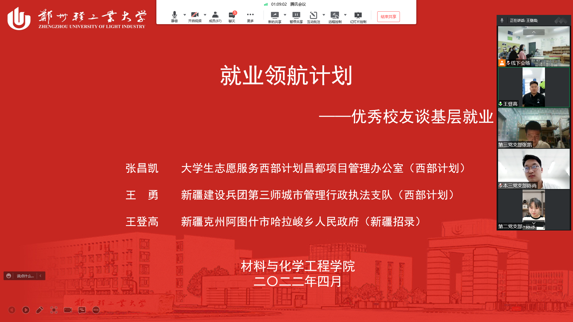 4月21日晚上,材料与化学工程学院举办了基层就业交流分享会,会议邀请了近几年基层就业的优秀校友王登高、张昌凯、王勇在线分享在基层、在西部的收获与成长。院党委副书记司丽娜、就业专职老师刘贝贝、有意愿参加基层就业的毕业生及大三部分学生参加了会议。会议由刘贝贝老师主持。