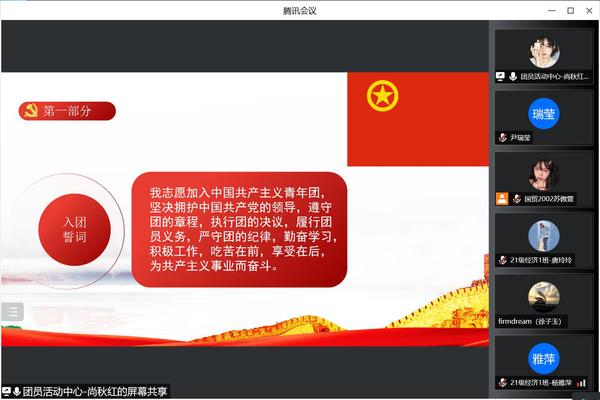 活动伊始,主持人尚秋红带领同学们重温入团誓词,强调了共青团员要担当起青春使命,增强团员意识,增强三个自信,坚定信仰信念。紧接着,主持人带领同学们从共青团在新时代的基本任务、共青团的组织原则、改革开放和现代化建设事业的深入发展对共青团工作提出更高要求这三个方面让广大团员青年更加深刻地了解共青团组织的发展奋斗史。在分享感悟环节,一位同学分享到:“通过此次活动,我认识到作为新时代的青年,光荣的共青团员,更应该严于律己,宽以待人,努力学习科学文化知识,德智体美劳全面发展,为共青团的发展蓄力。”活动最后,主持人引领同学们共同在团旗下唱响团歌,唱响青春!