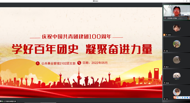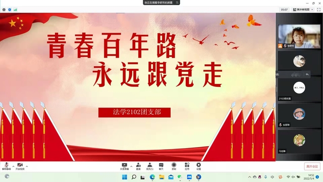 为庆祝中国共产主义青年团成立100周年,激励广大青年学子传承五四精神,以昂扬的斗志和精神状态迎接党的二十大胜利召开,5月4日,政法学院各团支部开展“青春百年路,永远跟党走”线上主题团日活动。