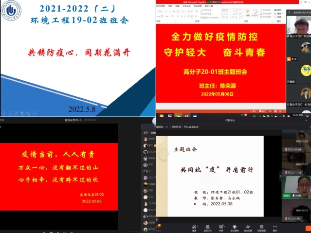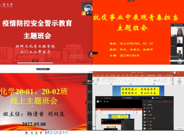 5月7日,材料与化学工程学院发布《关于校园实行封闭管理期间广大教师参与学生教育管理工作的通知》,全体系(中心)主任、班主任、研究生导师立刻行动,以线上指导方式加入疫情防控、学生管理工作队伍,协助完成学生教育、管理、服务等工作。5月7日-8日,全体辅导员、班主任召开线上疫情防控主题班会。