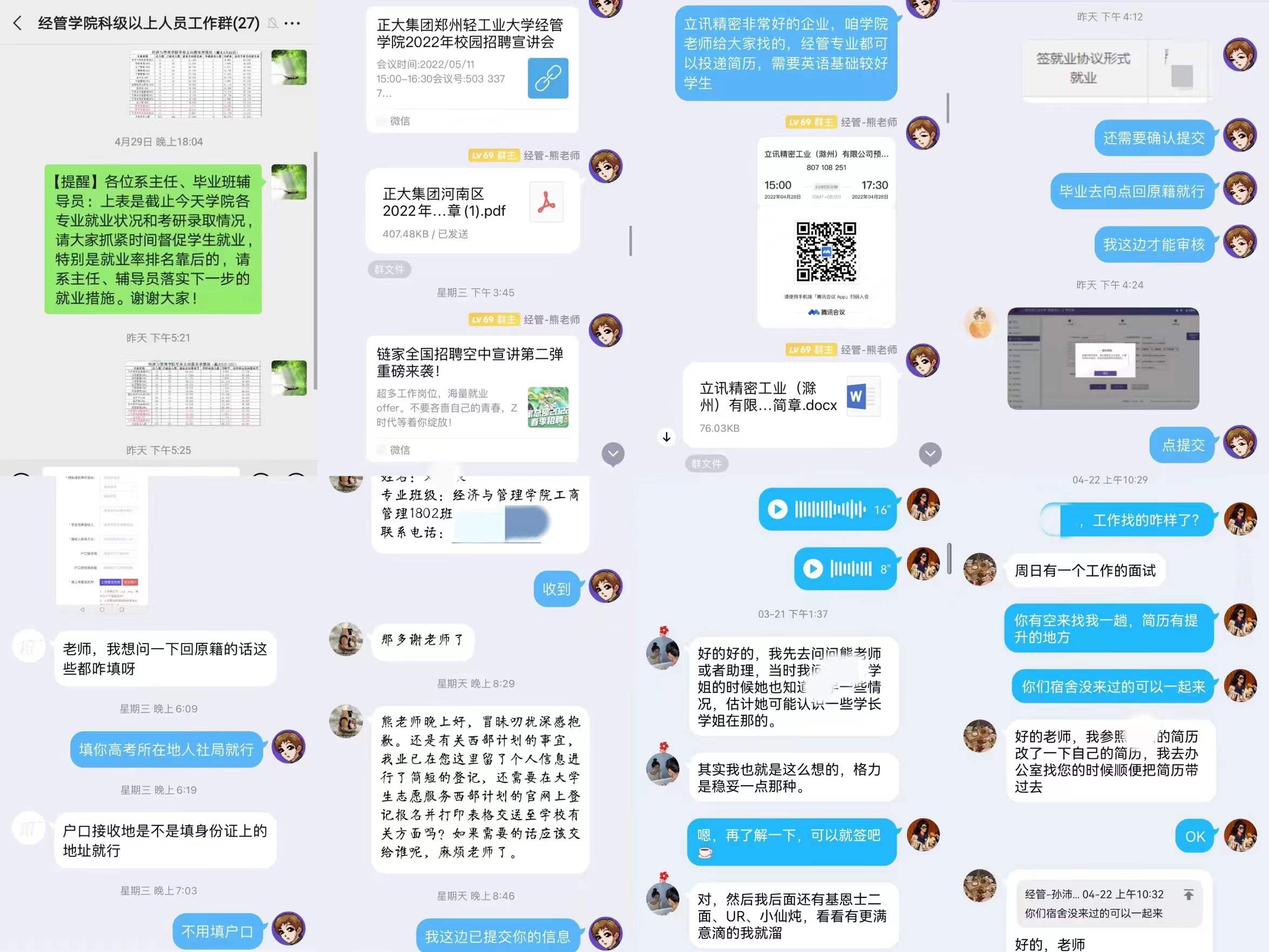 织密暖心就业保障网。学院坚持做好疫情防控下的毕业生就业工作,积极汇集用人单位招聘信息,每天梳理筛选重点信息及时推送给全体毕业生。学院用好教育部“24365校园招聘服务”平台、利用班主任论坛、开通云端24小时“QQ就业客服”等措施,通过线上平台为学生积极开展访企拓岗线上宣讲招聘会,为毕业生提供不断线、精准贴心的就业招聘服务。同时,学院讲好防疫心理健康课,分享疫情防控心理健康知识,辅导员和班主任24小时待命,提供“屏对屏”暖心陪伴,及时为学生答疑解惑,做好“云支持”,织密暖心就业保障网。