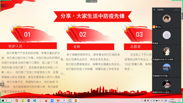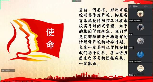 活动中,主持人首先围绕郑州发布《关于做好全市多轮核酸检测的通告》、我校《关于持续做好疫情防控工作和调整校园封闭管理措施的通知 (2022年12号)》等通知中的重要内容,解读目前防疫工作的严峻性和各级要求。随后通过PPT的形式,向大家展示此次疫情中的医护劳动者们,传达并学习他们众志成城、齐心协力、抗击疫情的精神,同时向大家介绍我校为疫情努力工作的医护人员、老师、和志愿者们无私的精神。活动最后,同学们也积极留言、互相交流学习成果,纷纷表示对学校的疫情防控政策表示理解和配合,在行动和精神上努力向他们靠拢。