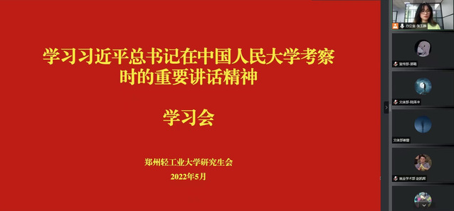 5月12日下午,我校研究生会组织学习习近平总书记在中国人民大学考察时的重要讲话精神,学习以线上学习会形式进行。研究生会全体成员参会。