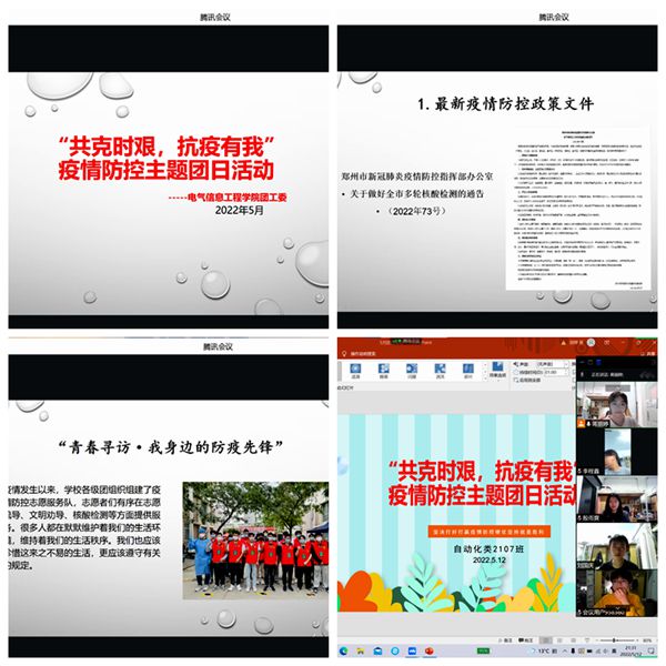 为深入贯彻落实习近平总书记关于疫情防控工作的重要讲话和指示精神,引导轻工大青年学生深刻认识每个人都是抗击疫情的责任人,增强战胜疫情的信心和决心,发挥团员青年的先锋模范作用。2022年5月10-12日,电气信息工程学院各基层团支部线上开展“共克时艰,抗疫有我”疫情防控主题团日活动。