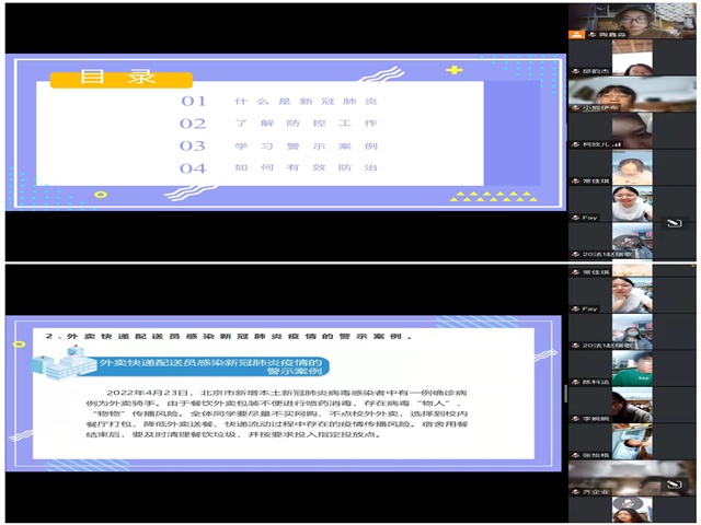 团日活动中,各支部深刻领会国家、河南省教育系统、学校最新疫情防控政策文件精神,充分认识疫情防控形势的复杂性和严峻性,认真履行疫情防控个人责任与义务,理解、支持、配合学校的疫情防控政策,树立抗疫必胜的坚定信心;各支部认真学习了疫情防控科普知识,做到正确认识疫情、掌握疫情发展动态、科学认知疫情的严峻性和危害性;结合近期省内外高校发生的学生违反疫情防控规定的典型案例,从社会、学校、个人等方面讲述了学生违纪带来的风险及不良影响;各支部分享了身边的防疫先锋的志愿服务先进事迹,在这场没有硝烟的“战疫”中,青年学子提高站位、主动作为,积极参与校园疫情防控志愿服务,用实际行动诠释着新时代青年的责任与担当。