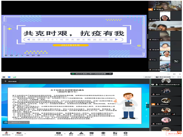 为深入贯彻落实习近平总书记关于疫情防控工作的重要讲话和指示精神,积极配合我校防疫工作,引导团员青年提升个人防护意识,5月9日-5月15日,政法学院各团支部开展“共克时艰,抗疫有我”疫情防控线上主题团日活动。