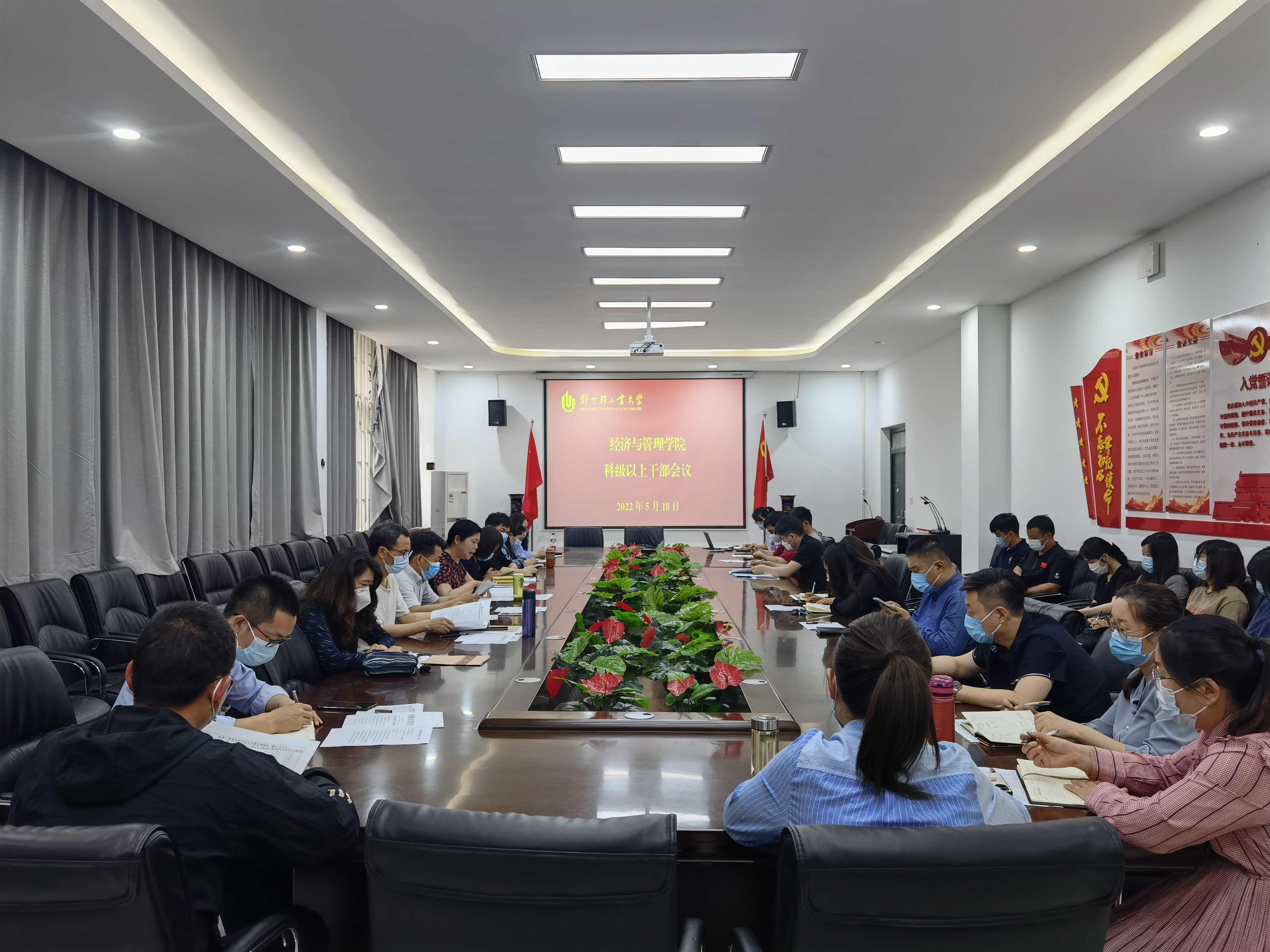 为贯彻落实好学校中层干部会议精神,统筹做好疫情防控及学院中心工作,5月18日下午,经济与管理学院在经管楼116会议室召开科级以上干部会议,学院领导班子成员、全体科级干部及专兼职辅导员参加了会议。会议由院长刘珂主持。